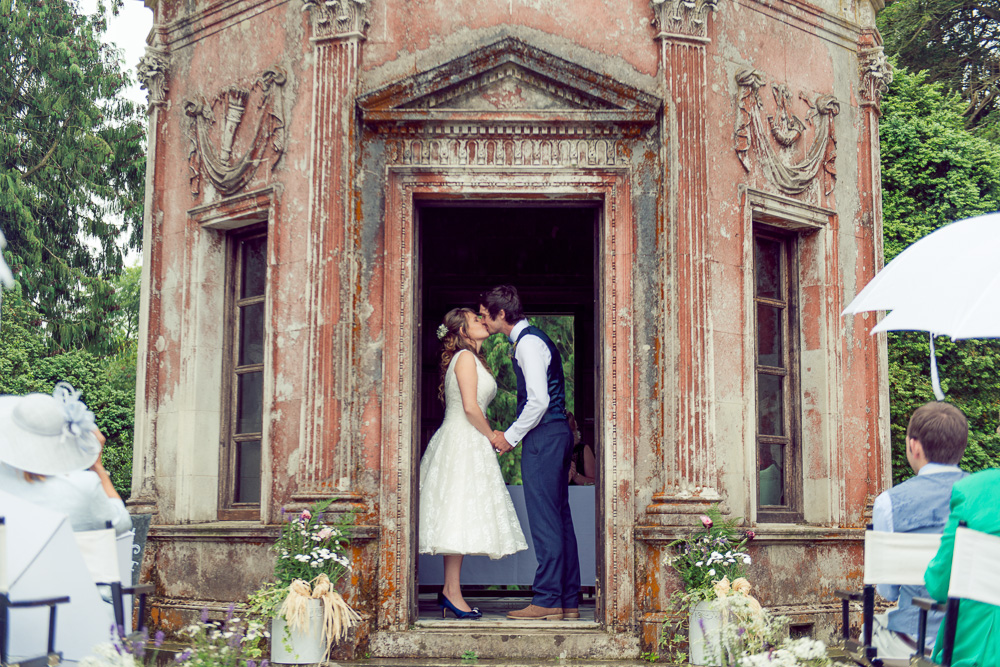 There are several covered locations at the Larmer tree and L & J had opted to have their ceremony in the Roman Temple with their guests seated just outside. The staff at the Larmer Tree were fantastic, they provided white umbrellas for all the guests and covered the chairs so everyone was kept dry and cosy!